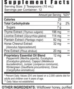 Ingredients: Thyme Extract, Licorice Extract, Plantain Extract, Horse Chesnut Extract, Pine Extract, Proprietary Essential Oil Blend [Peppermint (Mentha piperita), Eucalyptus (Eucalyptus globulus), Cajeput (Melalueca leucadendron), Juniper (Juniperus communis), Wintergreen (Gautlheria procumbrens), Clove (Caryphyllus aromaticus)], wildflower honey, purified water, citric acid.