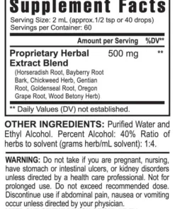 Ingredients: Herbal Formula: Horseradish Root, Bayberry Root Bark, Chickweed Herb, Gentian Root, Goldenseal Root, Oregon Grape Root, Wood Betony Herb.