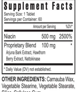 Ingredients: Niacin, Proprietary Blend (Arjuna Bark Extract, Hawthorn Berry Extract, Nattokinase), Carnauba Wax, Vegetable Stearine, Vegetable Stearate, Silica, Cellulose Gum.