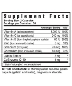 Ultimate Vision Fx is designed to promote optimal eye health. It contains a unique combination of Vitamin A (from beta carotene), Vitamin C, Vitamin E, Zinc, Selenium, Chromium, Lutein, and Co-enzyme Q10. For optimal results, incorporate Ultimate Vision Fx into a comprehensive nutritional regimen that also includes Ultimate Classic and Ultimate EFA.